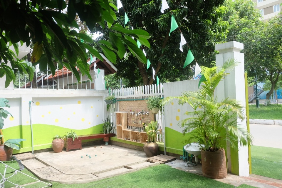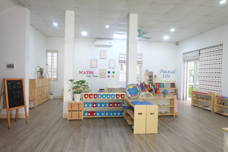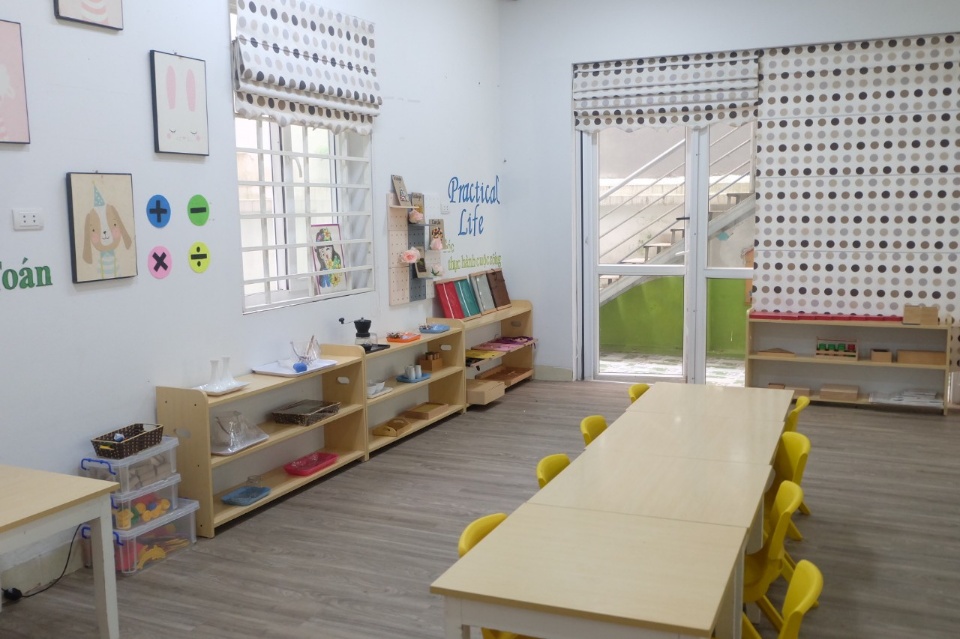 Cơ sở vật chất khang trang, diện tích phòng học rộng với đồ chơi và giáo cụ đạt chuẩn. Có không gian sân chơi ngoài trời cho bé thỏa sức vận động, chạy nhảy.